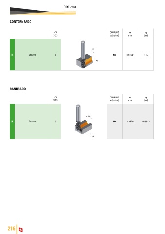 DIXI 7323 CONTORNEADO VDI CARBURO ae ap 3323 Vc [m/min] (mm) (mm) H Espuma 30 400 < 0.8 × ØD1 < 1 × L1 RANURADO VDI CARBURO ae ap 3323 Vc [m/min] (mm) (mm) H Espuma 30 335 < 1 × ØD1 < 0.80 × L1 216