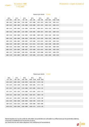 Valores basados en el uso de aceite de corte entero. Los parámetros de corte están muy influenciados por los parámetros externos,