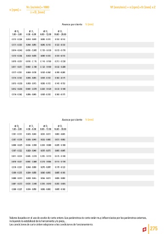 Valores basados en el uso de aceite de corte entero. Los parámetros de corte están muy influenciados por los parámetros externos,