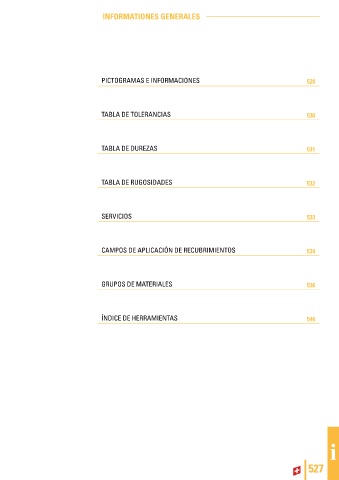 INFORMATIONES GENERALES PICTOGRAMAS E INFORMACIONES 528 TABLA DE TOLERANCIAS 530 TABLA DE DUREZAS 531 TABLA DE RUGOSIDADES 532 SERVICIOS 533 CAMPOS DE APLICACIÓN DE RECUBRIMIENTOS 534 GRUPOS DE MATERIALES 536 ÍNDICE DE HERRAMIENTAS 546 527
